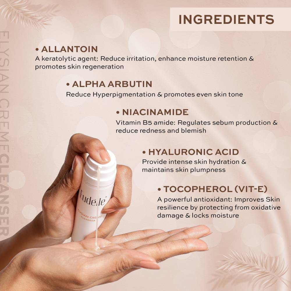 Regular use of Elysian Crème Cleanser can help: -Brighten and even skin tone with Alpha Arbutin and Vitamin C. -Hydrate and plump the skin with Hyaluronic Acid. -Soothe and calm with Allantoin and D-Panthenol. -Gently exfoliate dead skin cells with Lactic Acid. -Protect against oxidative damage with Vitamin E and Niacinamide.